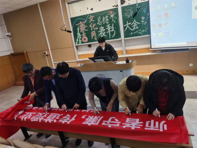 会上,大家共同观看了学院领导班子成员录制的家属助廉微视频和助廉寄语、年轻科级干部录制的廉政微视频、“廉洁文化月”活动剪影和获奖作品。院领导班子成员在印有“师者守廉,传道授业皆正气;学子尚洁,求知问道有清风”的布标上签名,与会师生代表也共同参加了廉洁承诺签名活动。