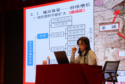 史煜涵以“天津市城市与红色资源”为题开展专题讲座,她从近代天津历史概述切入,延伸到近代天津城市特质与红色革命的关系,进而引出近代城市与革命问题的几点思考。通过声情并茂的讲述,再现了近代天津经历的磨难和斗争,深入浅出地讲解了天津在中国近现代历史进程中的重要地位、五大道的历史与建筑空间特点、五大道著名爱国民主人士故事等。史煜涵带领在场同学们一起回顾了天津历史,增强了大家对天津发展的信心,引导青年学生努力融入天津、建设天津、发展天津。