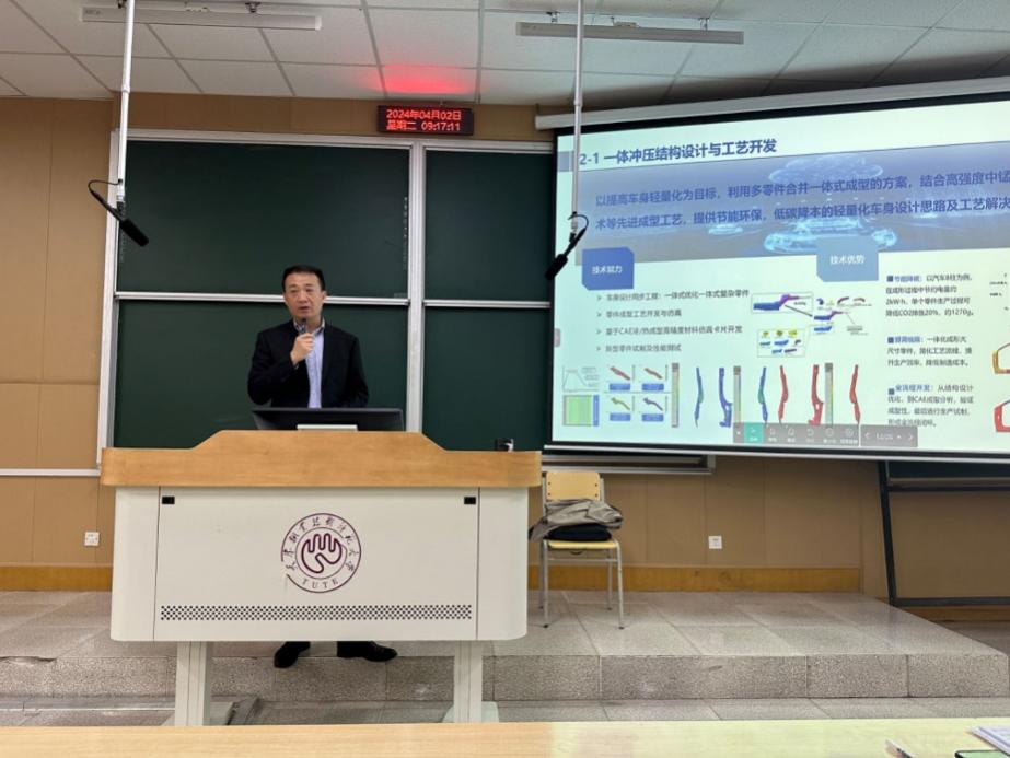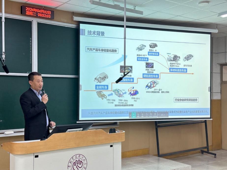 孟宪明以《新能源汽车大型一体式成型技术研究进展》为题作学术报告,阐述了车身一体化成型的研究背景、创新技术和实际应用的创新案例,并结合实际生产经验,对研究生的培养提出了意见和建议。讲座结束后,孟宪明和参会师生进行了深入沟通交流,并针对师生提出的问题进行了详细解答,现场氛围融洽。此次讲座对学院科研与学科工作发展起到了积极的推动作用。